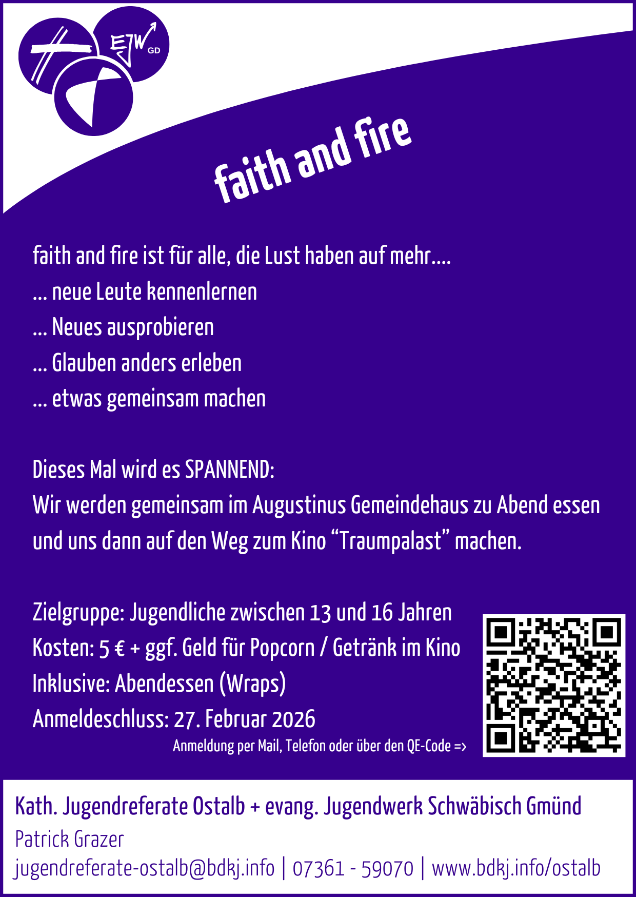 Wir werden gemeinsam im Augustinus Gemeindehaus zu Abend essen und uns dann auf den Weg zum Kino "Traumpalast" machen.