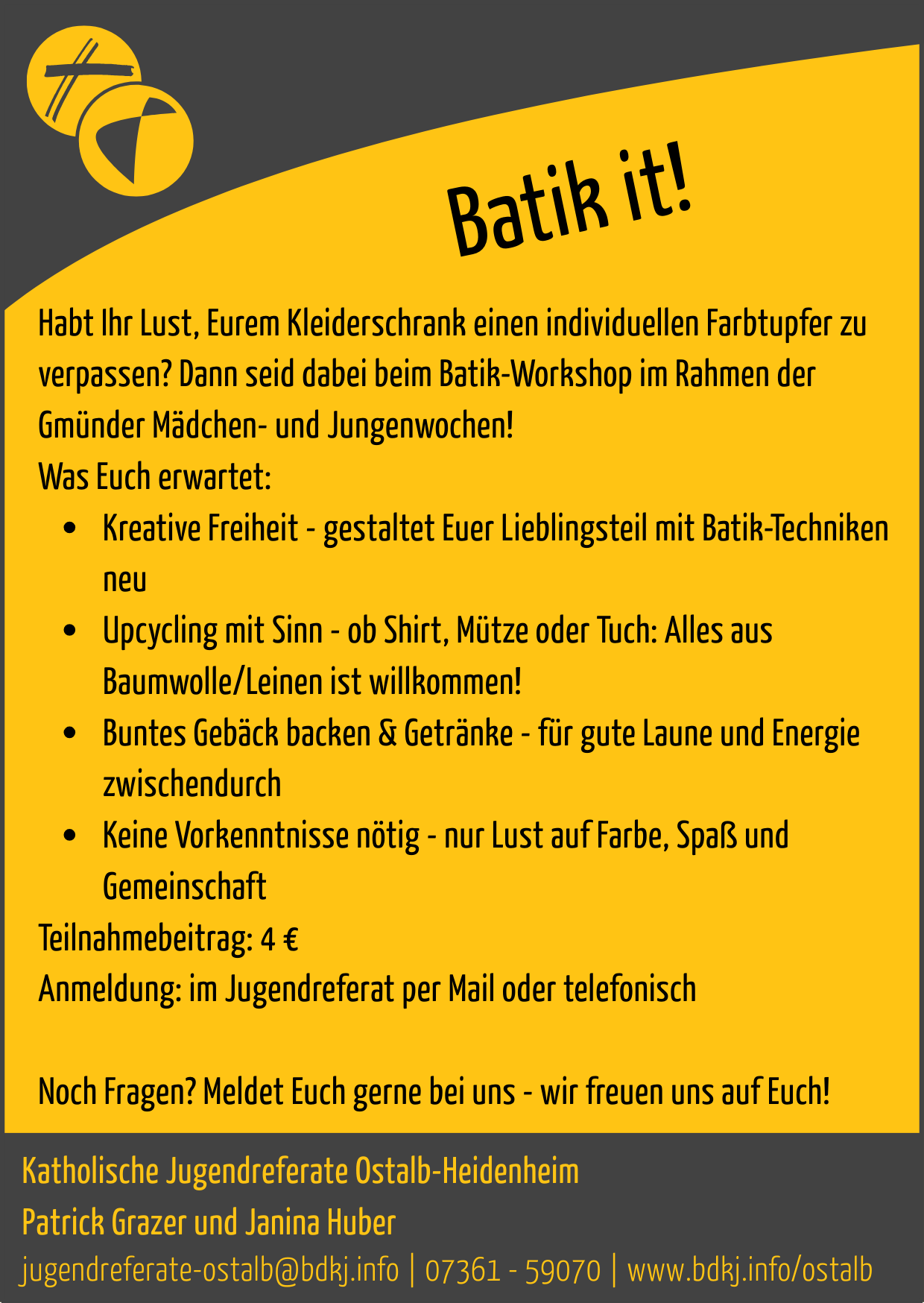 Batik it! Habt Ihr Lust, Eurem Kleiderschrank einen individuellen Farbtupfer zu verpassen? Dann seid dabei beim Batik-Workshop im Rahmen der Gmünder Mädchen- und Jungenwochen!