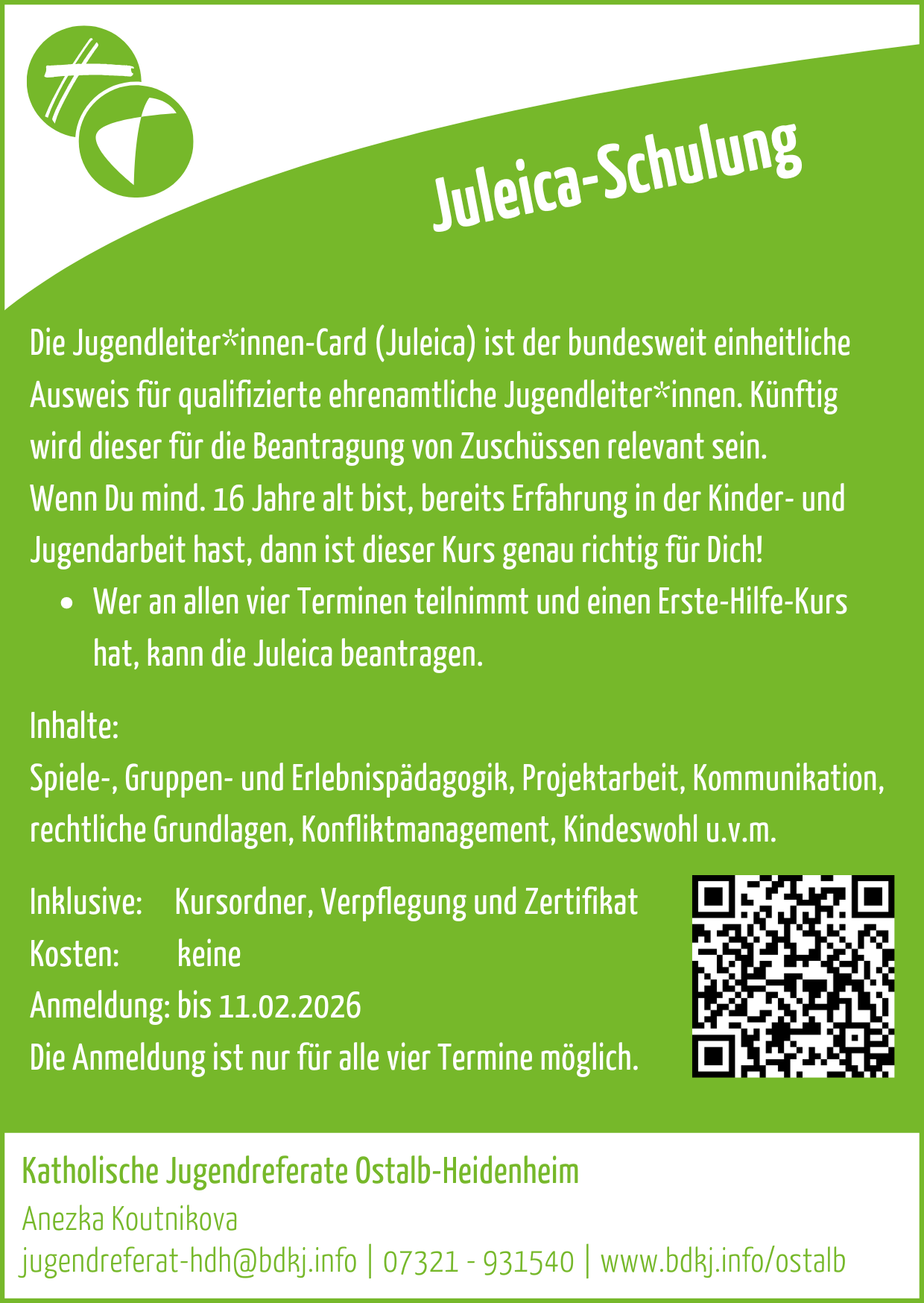 Die Teilnahme ist nur für alle 4 Termine möglich. Wer teilnimmt und einen Erste-Hilfe-Kurs hat, kann die Juleica beantragen.