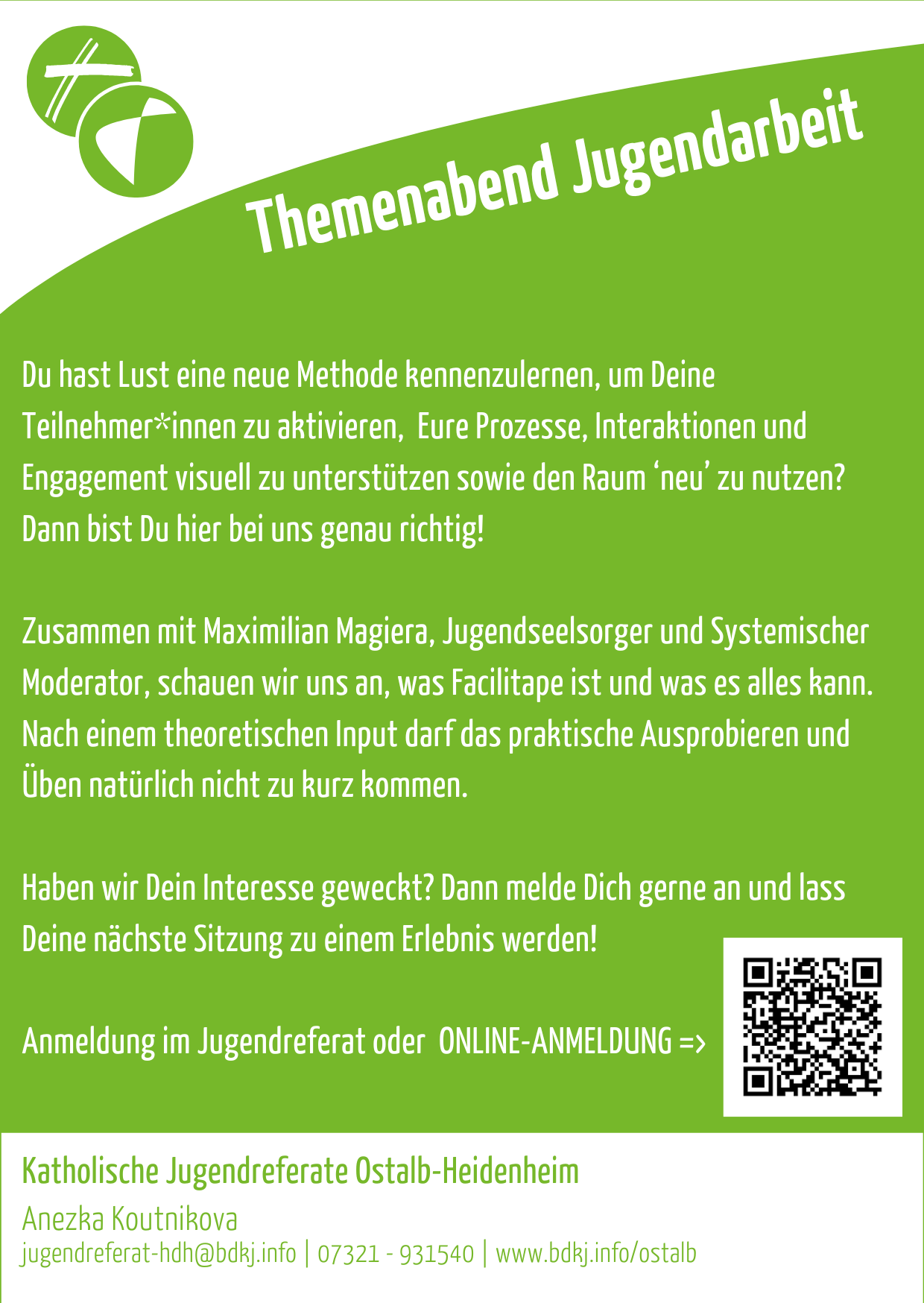 Zusammen mit Maximilian Magiera, Jugendseelsorger und Systemischer Moderator, schauen wir uns an, was Facilitape ist und was es alles kann. Nach einen theoretischen Input darf das praktische Ausprobieren und Üben natürlich nicht zu kurz kommen.